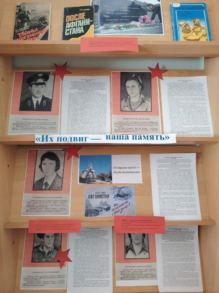 Мектеп кітапханасында Степногорск қаласының Ауған соғысына қатысқан жерлестері туралы көрме таныстырылды.