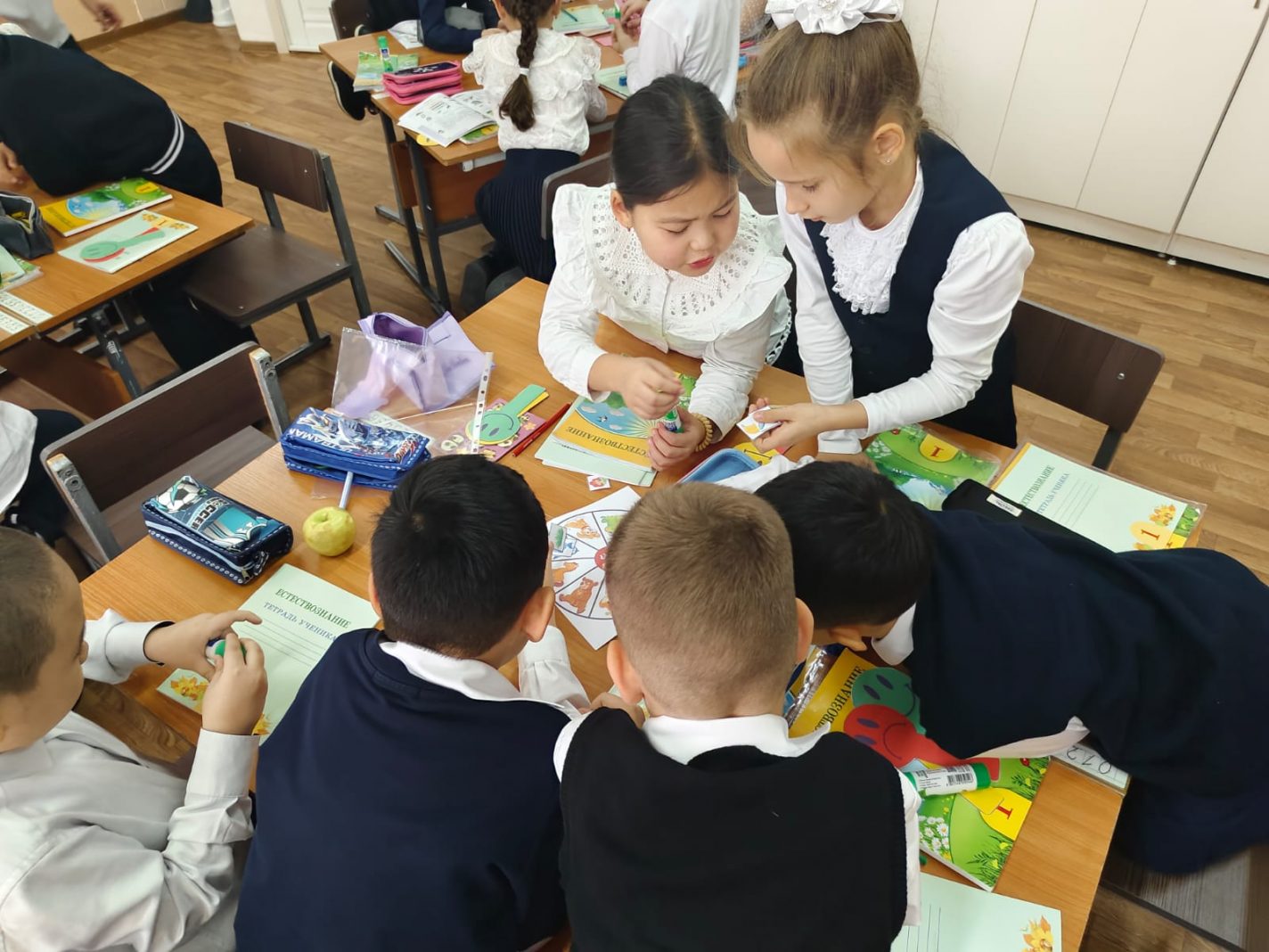 Сабақ барысында балалар топтарда жұмыс істеді: жануарлардың тамақтануы, олардың мекендейтін жерлері туралы суреттер салды, екі топқа бөлінді — жабайы және үй, жауаптарын талқылады, таңдауды дәлелдеді.
